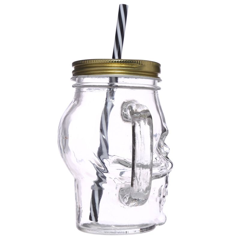 Bocal en verre tête de mort avec paille et couvercle métallique